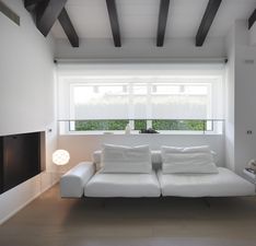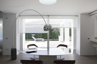 Liebhaber versteckter Technik setzen auf das Modell „Phantom“, bei dem ein Silent-Motor das Rollo in der abgehängten Decke verschwinden lässt. Sie haben die Auswahl zwischen 100 italienischen Stoffdesigns in unterschiedlichen Lichtdurchlässigkeiten, Farben und Strukturen.